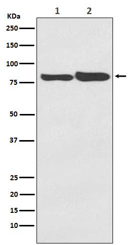 Western blot(SDS PAGE) analysis of extracts from (1) HeLa cell lysate; (2) 293 cell lysate.Using FACL4 Rabbit mAb [50QF]at dilution of 1:1000 incubated at 4℃ over night.