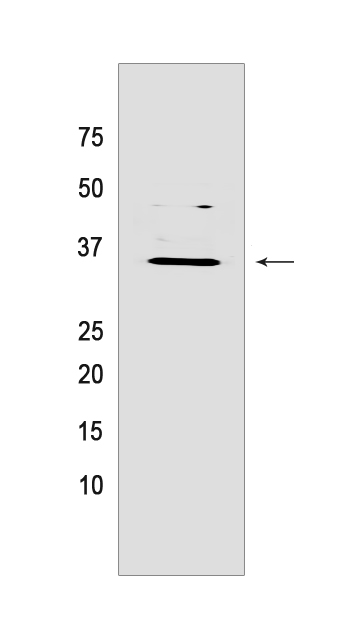 Western blot(SDS PAGE) analysis of extracts from HL-60 cells.Using ORAI1 Mouse mAb IgG [UQ4X] at dilution of 1:1000 incubated at 4℃ over night.