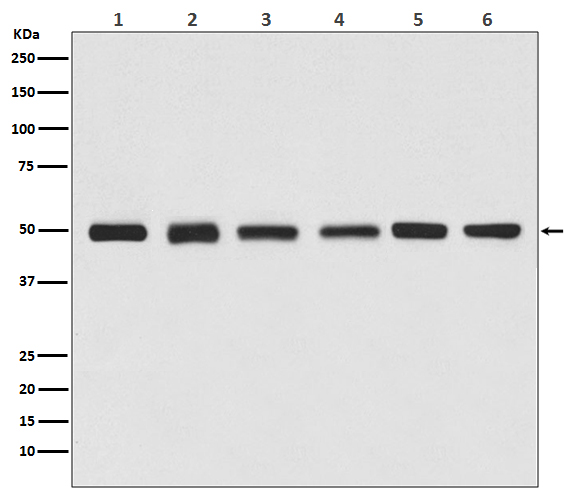 WB Positive detected :(1) Jurkat cell lysate, (2) Human kidney lysate, (3) 3T3 cell lysate, (4) Mouse brain lysate, (5) C6 cell lysate, (6) Rat heart lysate.